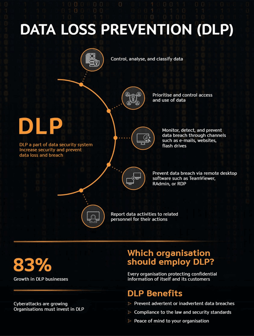 Data Loss Prevention (DLP) is a part of security system protecting your data. DLP helps prevent data loss and breach, reducing risks in case your organisations fall victim to cybercrime committed by external or internal parties.