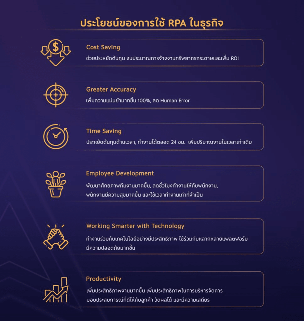 RPA ช่วยเพิ่มประสิทธิภาพในการทำงานมากขึ้น เนื่องจากได้งานคุณภาพที่ไม่มีข้อผิดพลาดในระยะเวลาอันรวดเร็วและยังมีความเสถียร รวมทั้งส่งผลดีต่อการบริหารจัดการขององค์กรอีกด้วย นอกจากนี้ ข้อมูลจาก RPA จะถูกจัดเก็บเอาไว้ใน Database ทำให้สามารถตรวจสอบข้อมูลย้อนหลังและวัดผลได้ เมื่อกระบวนการทำงานมีประสิทธิภาพและความรวดเร็วจึงช่วยส่งมอบประสบการณ์ที่ดีแก่ลูกค้าปลายทางตามไปด้วย